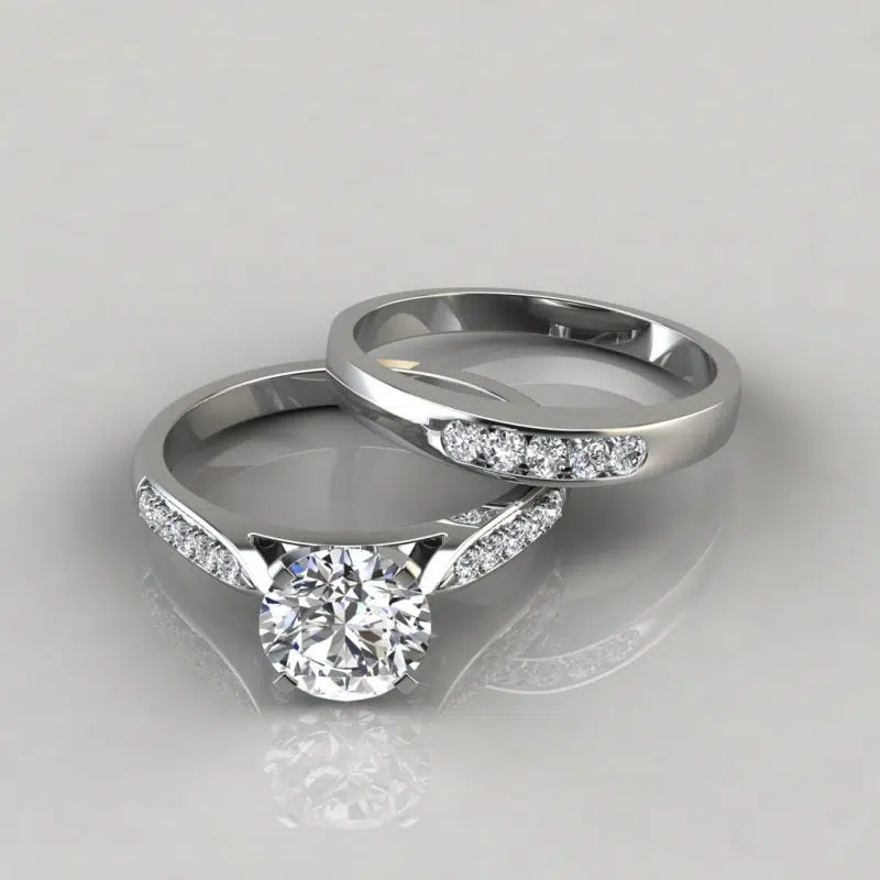 This Beautiful Moissanite Cathedral Pavé Engagement Ring and Wedding Band Set is available in White, Yellow or Rose Solid Gold (14K or 18K) and also in Platinum.
