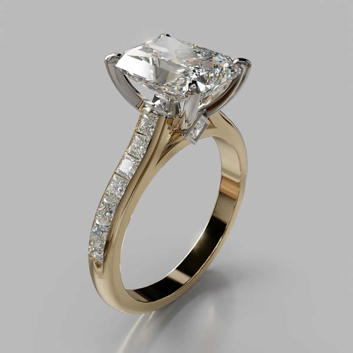 This Channel Set Cathedral Radiant Cut Moissanite Engagement Ring is available in White, Yellow or Rose Solid Gold (14K or 18K) and also in Platinum.