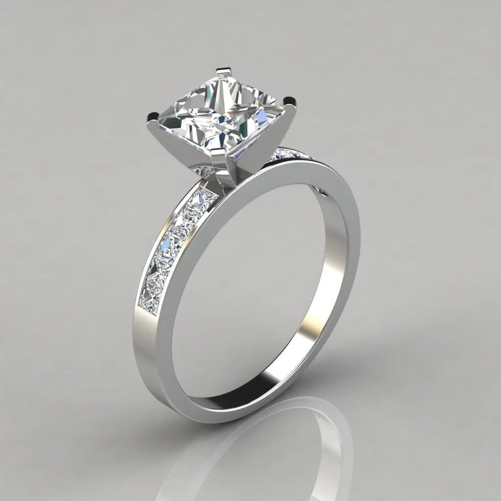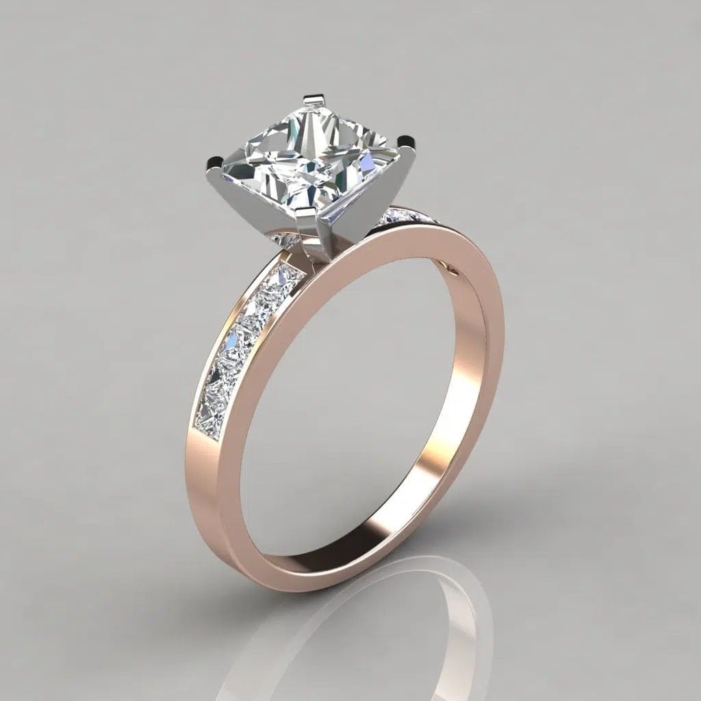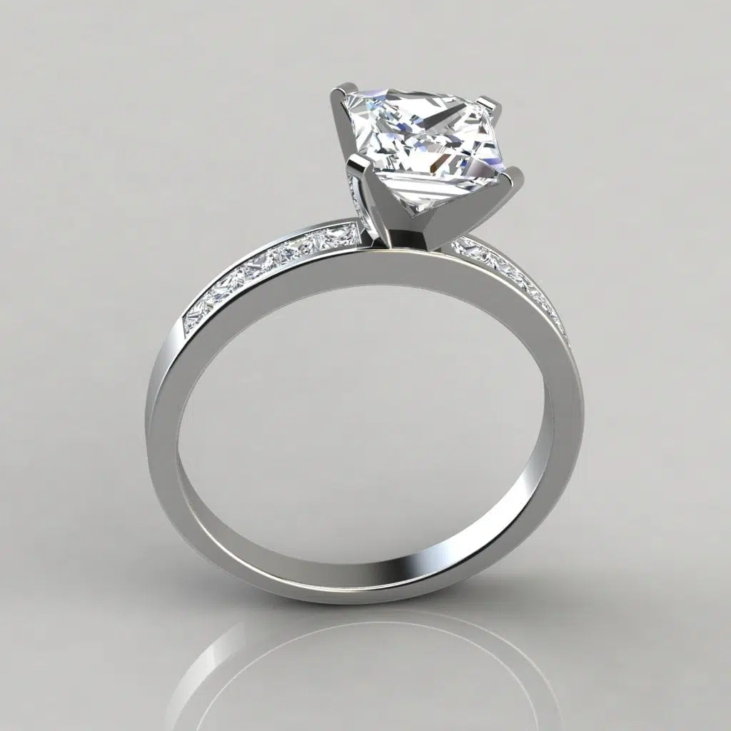 This Magnificent Moissanite Channel Set Princess Cut Moissanite Engagement Ring is available in White, Yellow or Rose Solid Gold (14K or 18K) and also in Platinum.