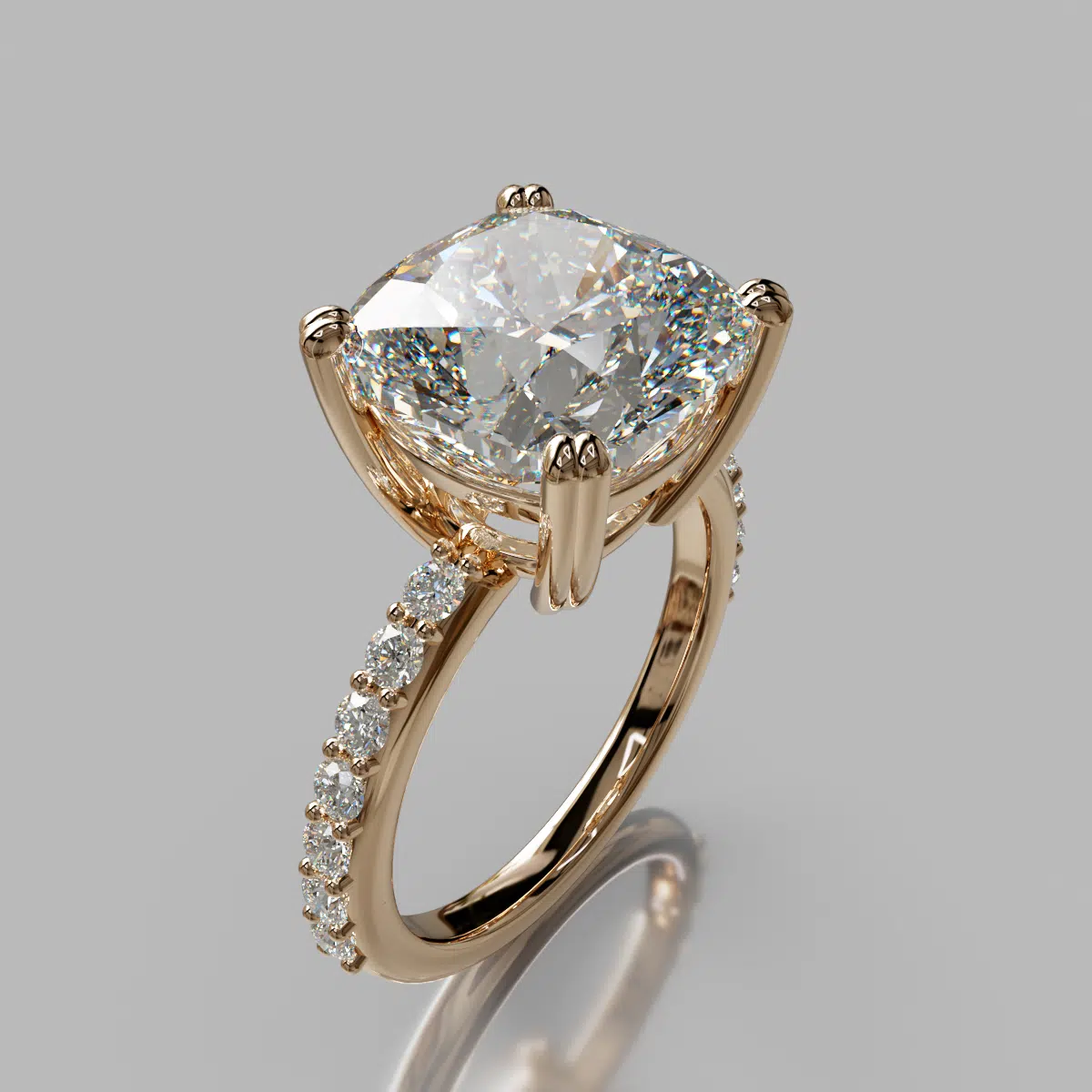 This Cushion Cut Moissanite Shared Prong Engagement ring is available in White, Yellow or Rose Solid Gold (14K or 18K) and also in Platinum.