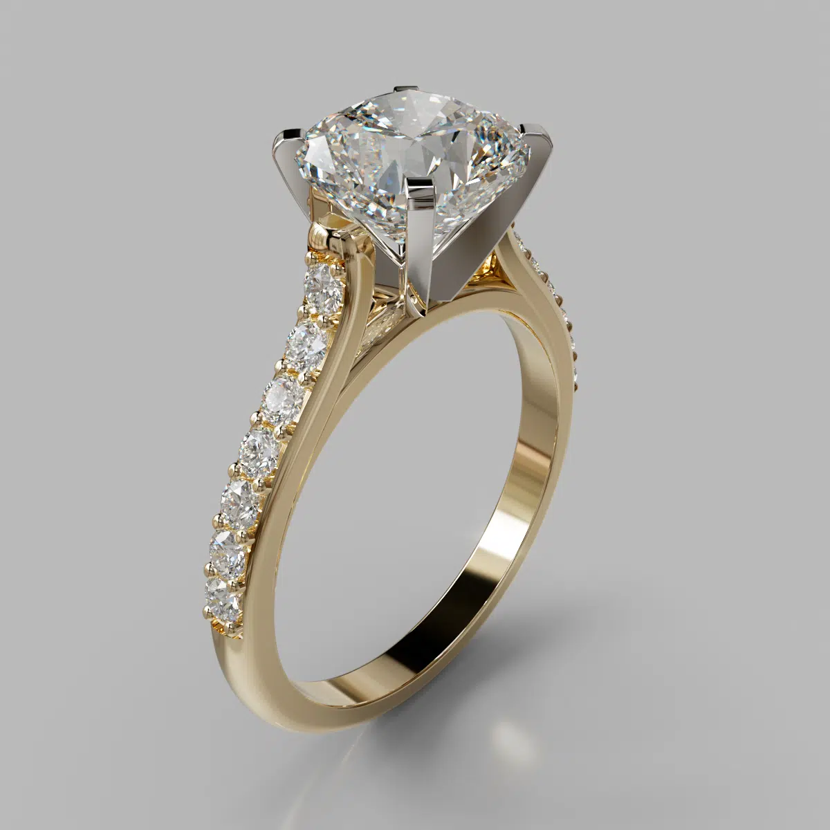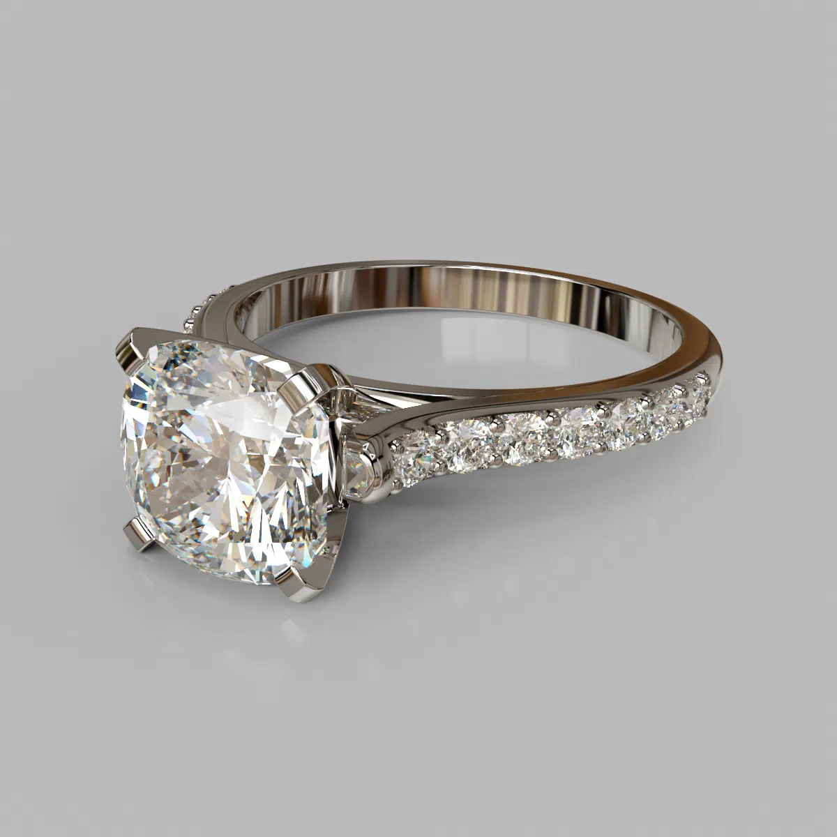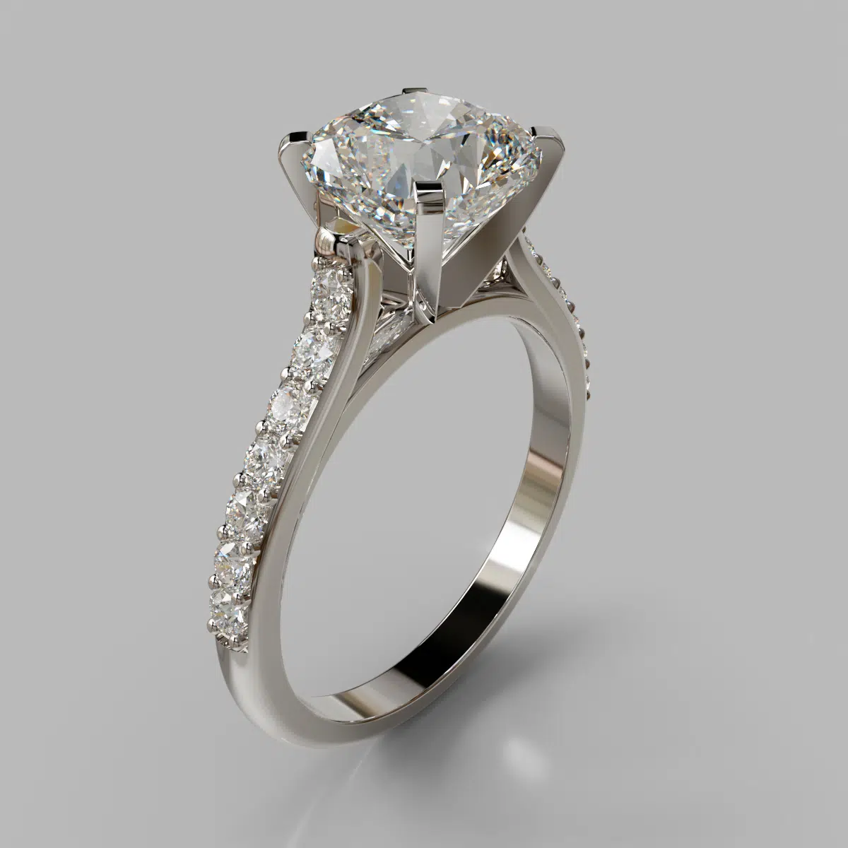 The ring can be customized to your exact specifications to accommodate a center stone from 1.00 to 3.00 carats and it comes as pictured with an additional 18 round brilliant cut side stones, in total carat weight of 0.25 Ct.