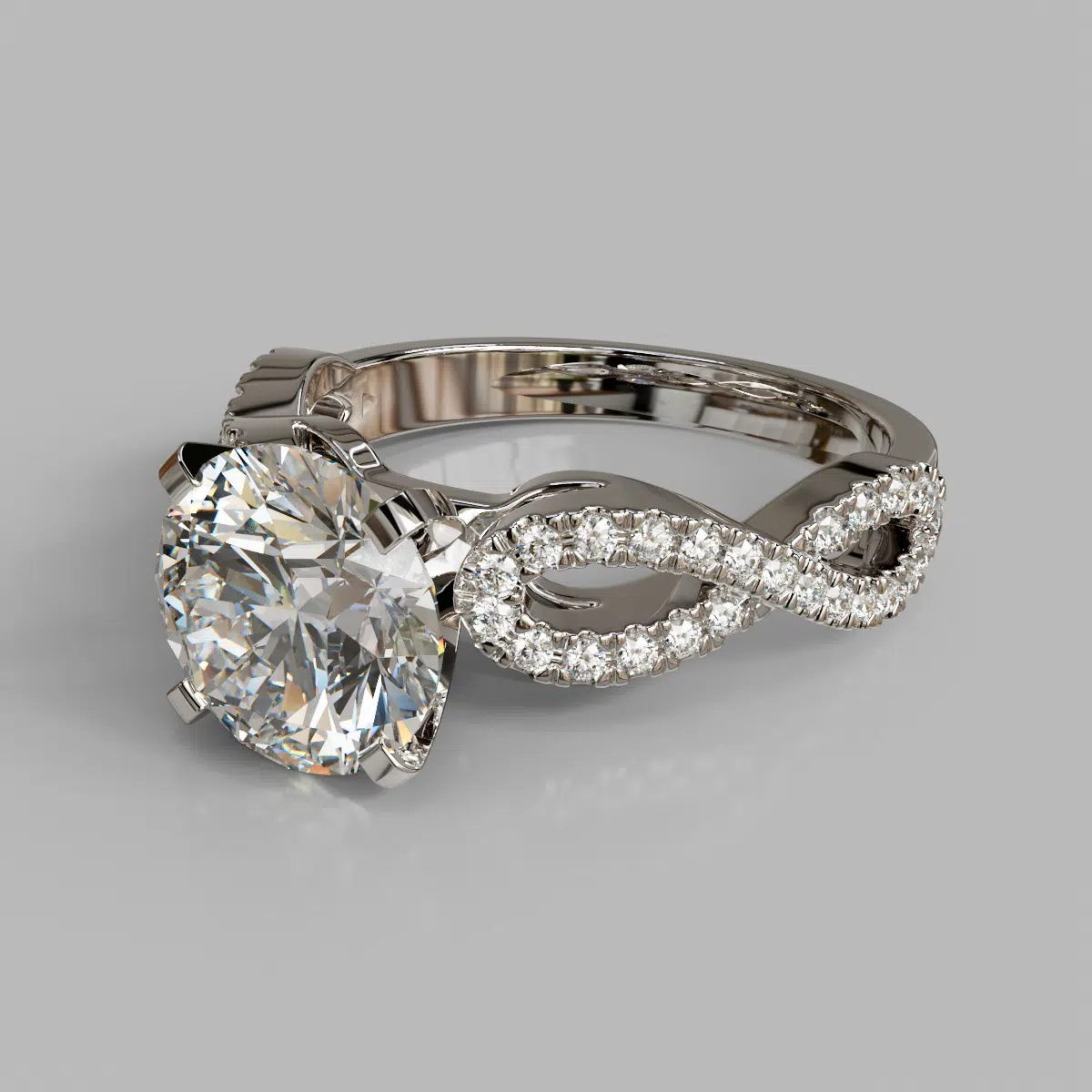 This Infinity Design Round Cut Moissanite Engagement Ring is available in White, Yellow or Rose Solid Gold (14K or 18K) and also in Platinum.