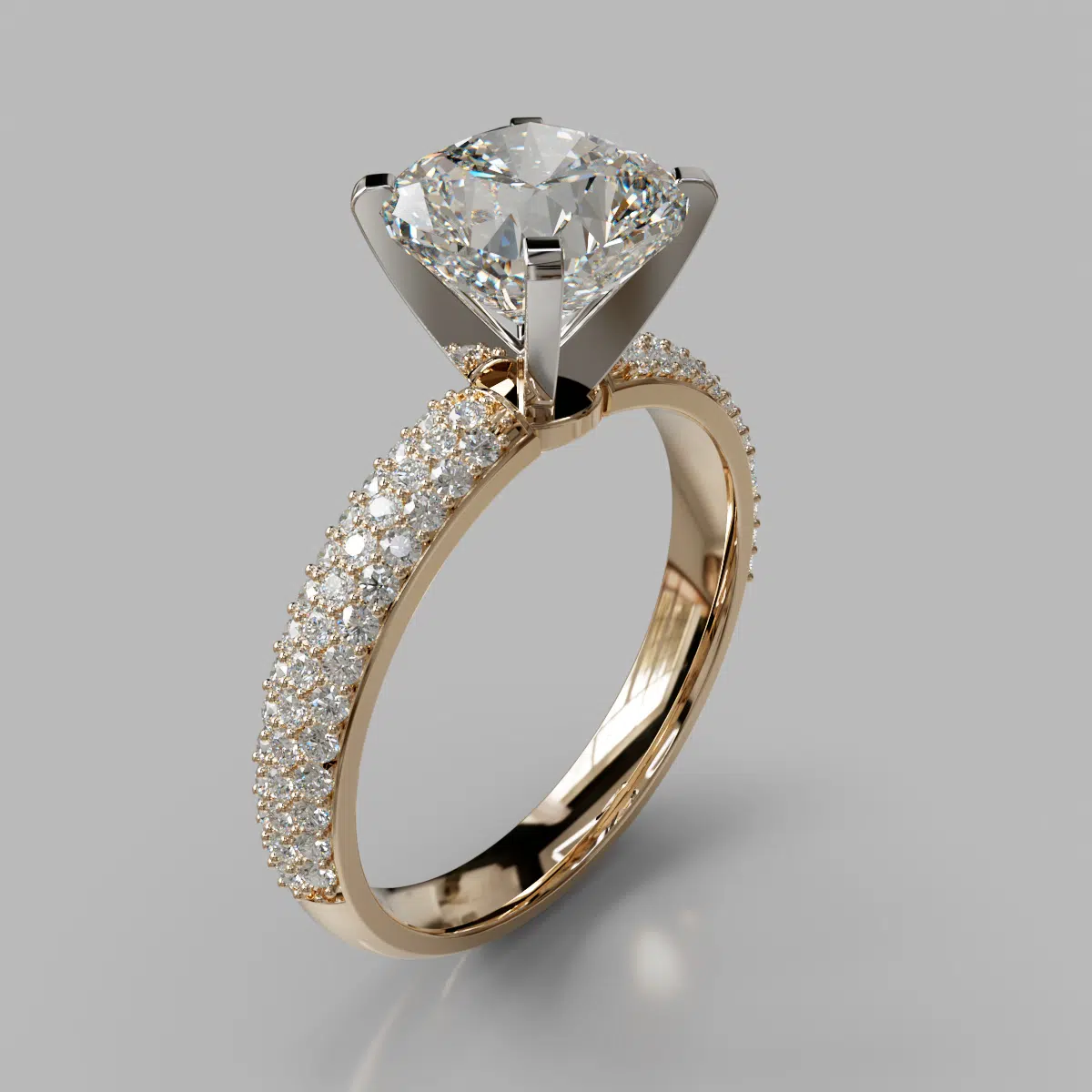 This Stunning Moissanite Micro Pavé Cushion Cut Engagement Ring is available in White, Yellow or Rose Solid Gold (14K or 18K) and also in Platinum.