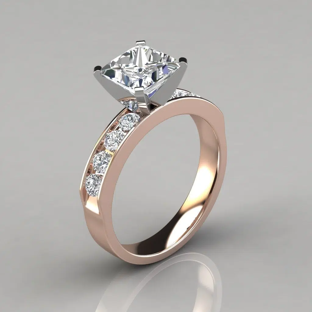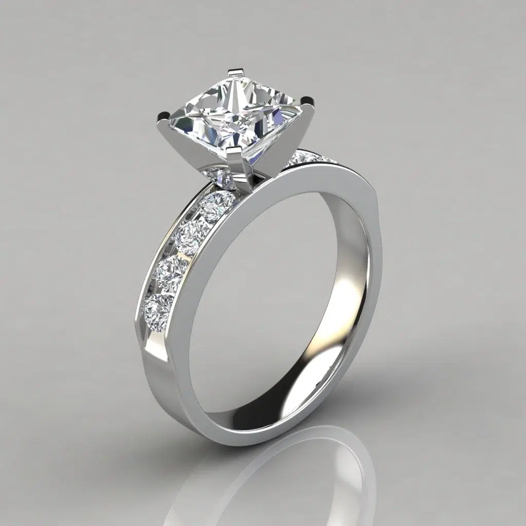 This Magnificent Moissanite Channel Set Engagement Ring with Accents is available in White, Yellow or Rose Solid Gold (14K or 18K) and also in Platinum.