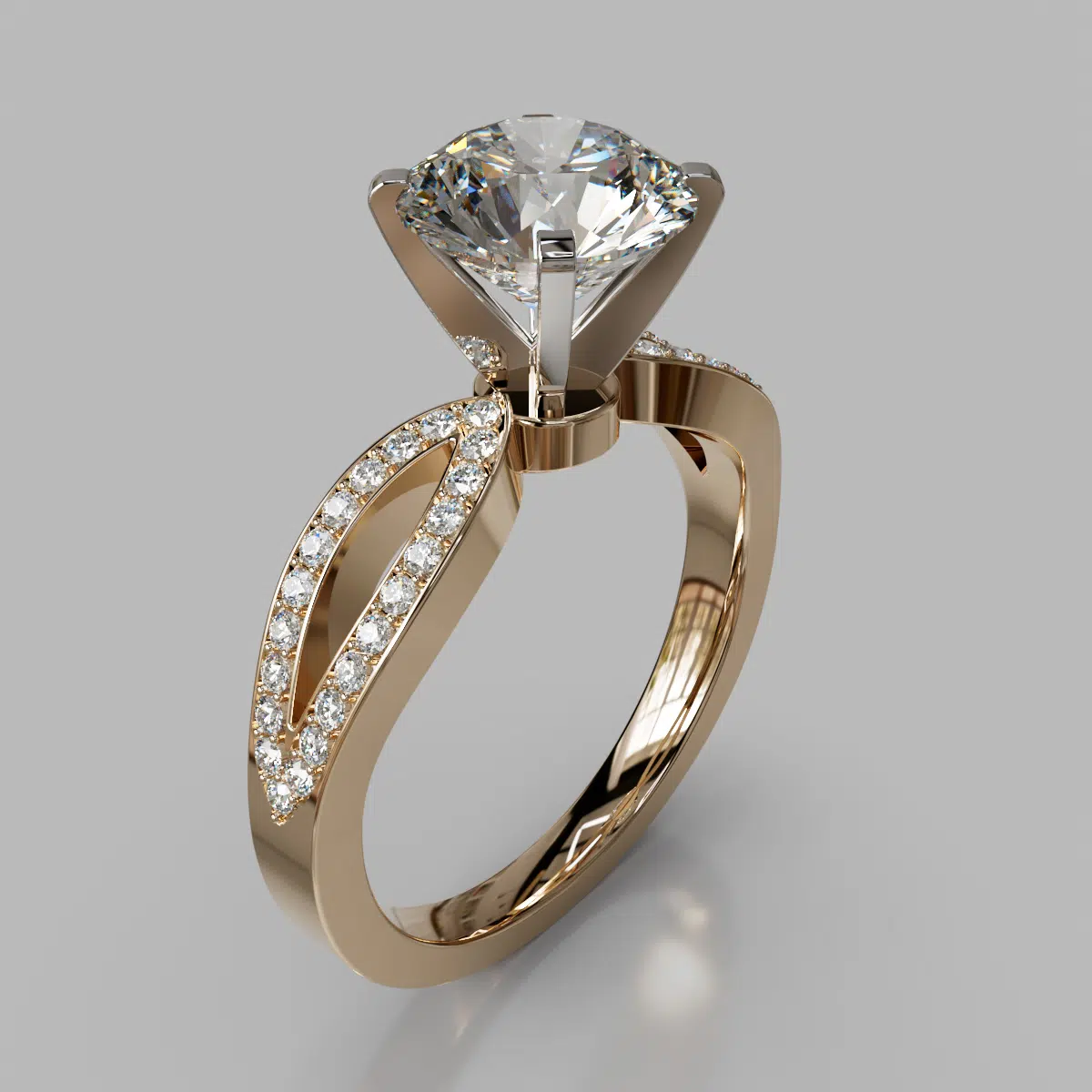 This Beautiful Moissanite Split Shank Engagement Ring With Accents is available in White, Yellow or Rose Solid Gold (14K or 18K) and also in Platinum.