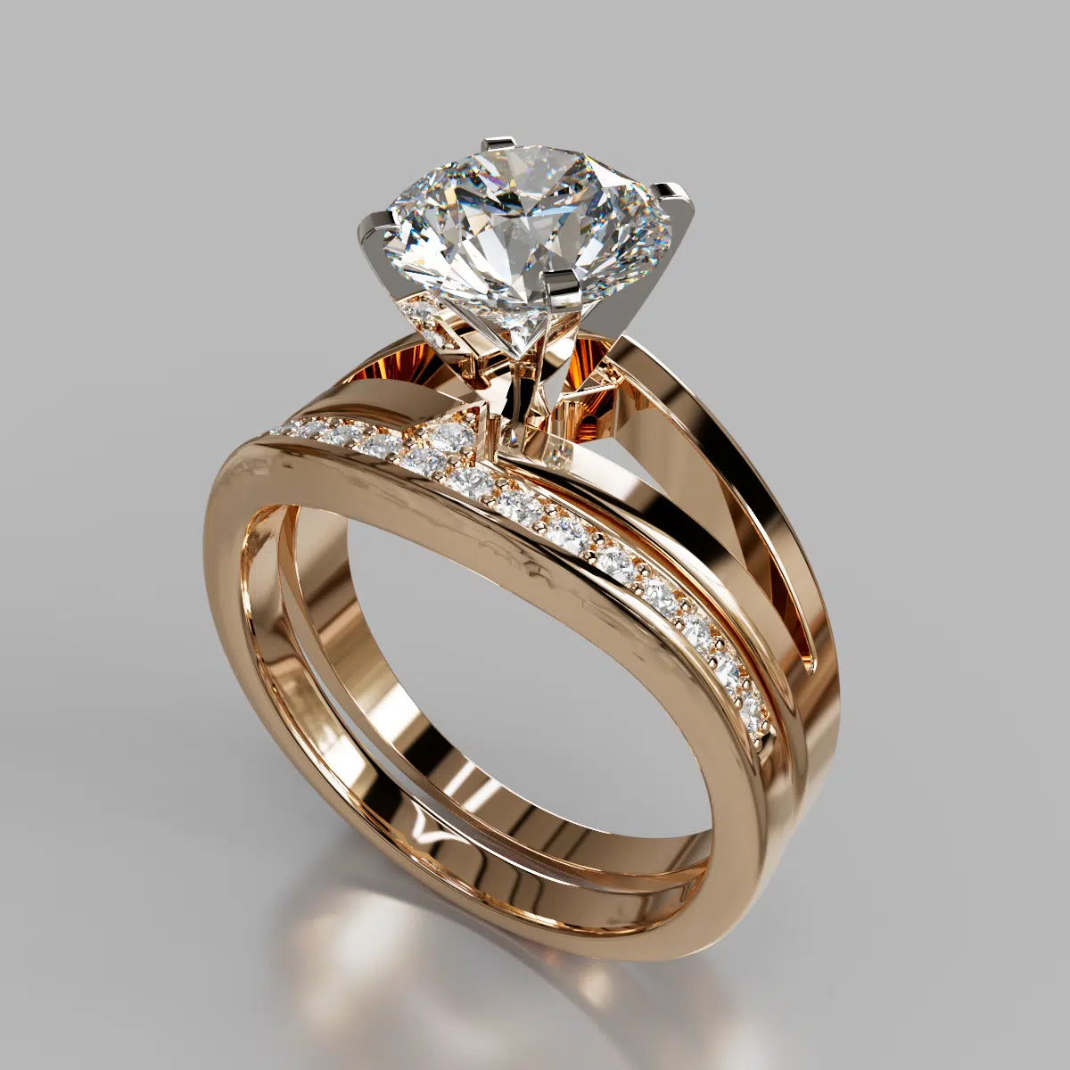 This Beautiful Moissanite Split Shank Solitaire Round Cut Bridal Set is available in White, Yellow or Rose Solid Gold (14K or 18K) and also in Platinum.