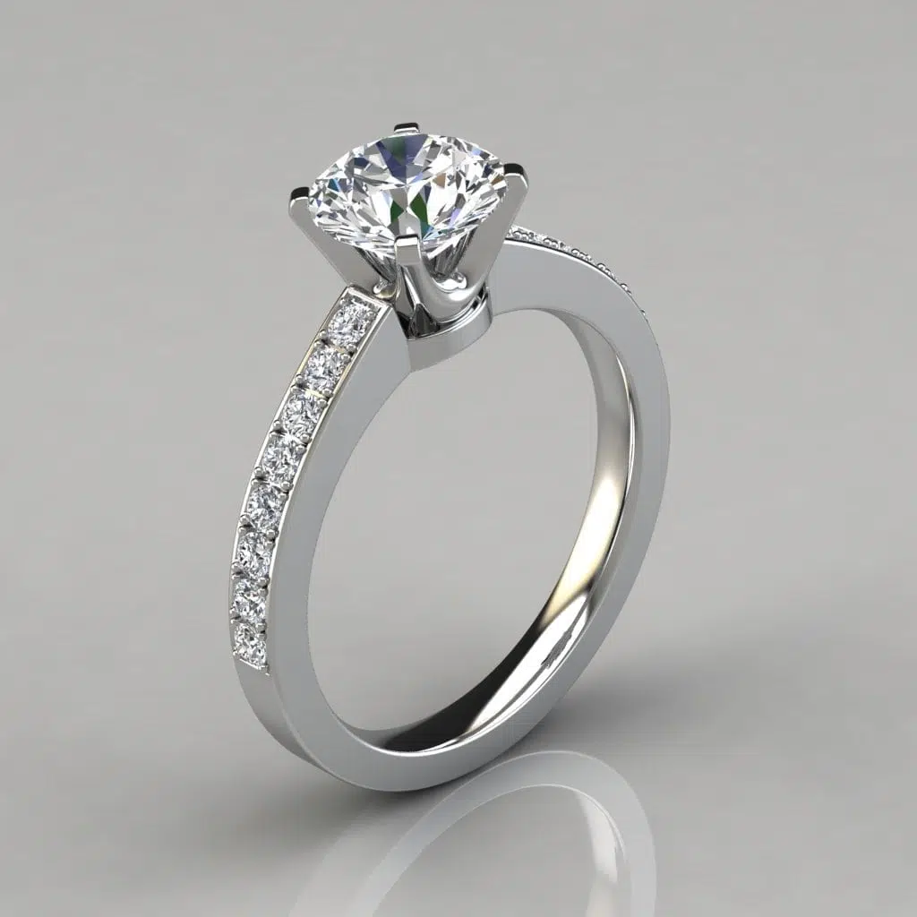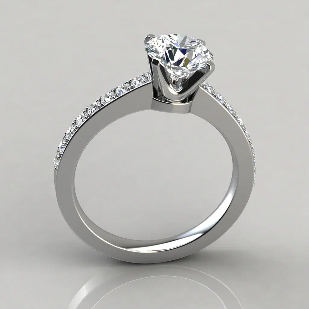 The ring can be customized to your exact specifications to accommodate a center stone from 1.00 to 3.00 carats and it comes as pictured with an additional 16 round brilliant cut side stones, in total carat weight of 0.32 Ct.