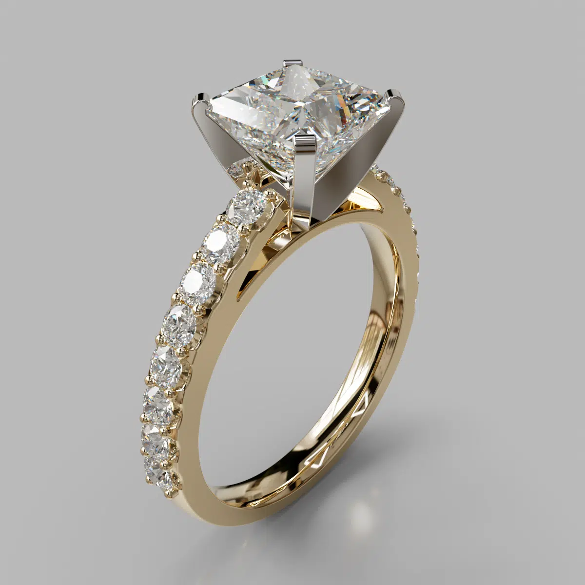 This Magnificent Princess Cut Cathedral Style Moissanite Engagement Ring is available in White, Yellow or Rose Solid Gold (14K or 18K) and also in Platinum.