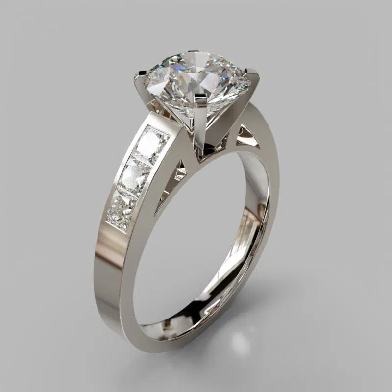 This Beautiful Moissanite Round Cut Channel Set Engagement Ring is available in White, Yellow or Rose Solid Gold (14K or 18K) and also in Platinum.