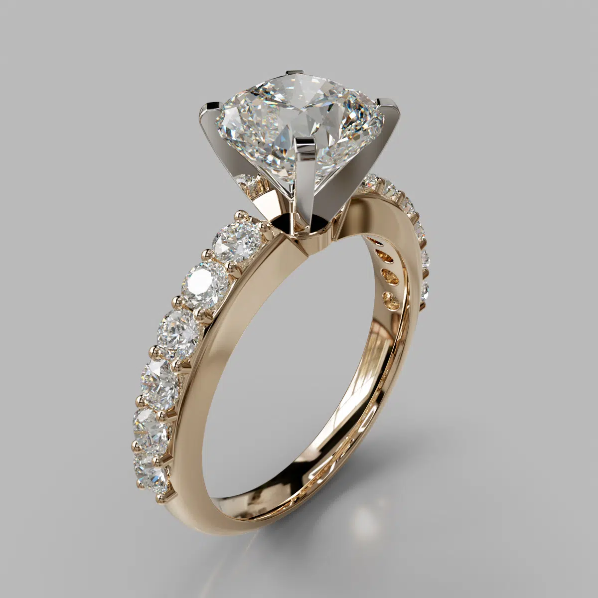This Shared Prong Cushion Cut Moissanite Engagement Ring is available in White, Yellow or Rose Solid Gold (14K or 18K) and also in Platinum.