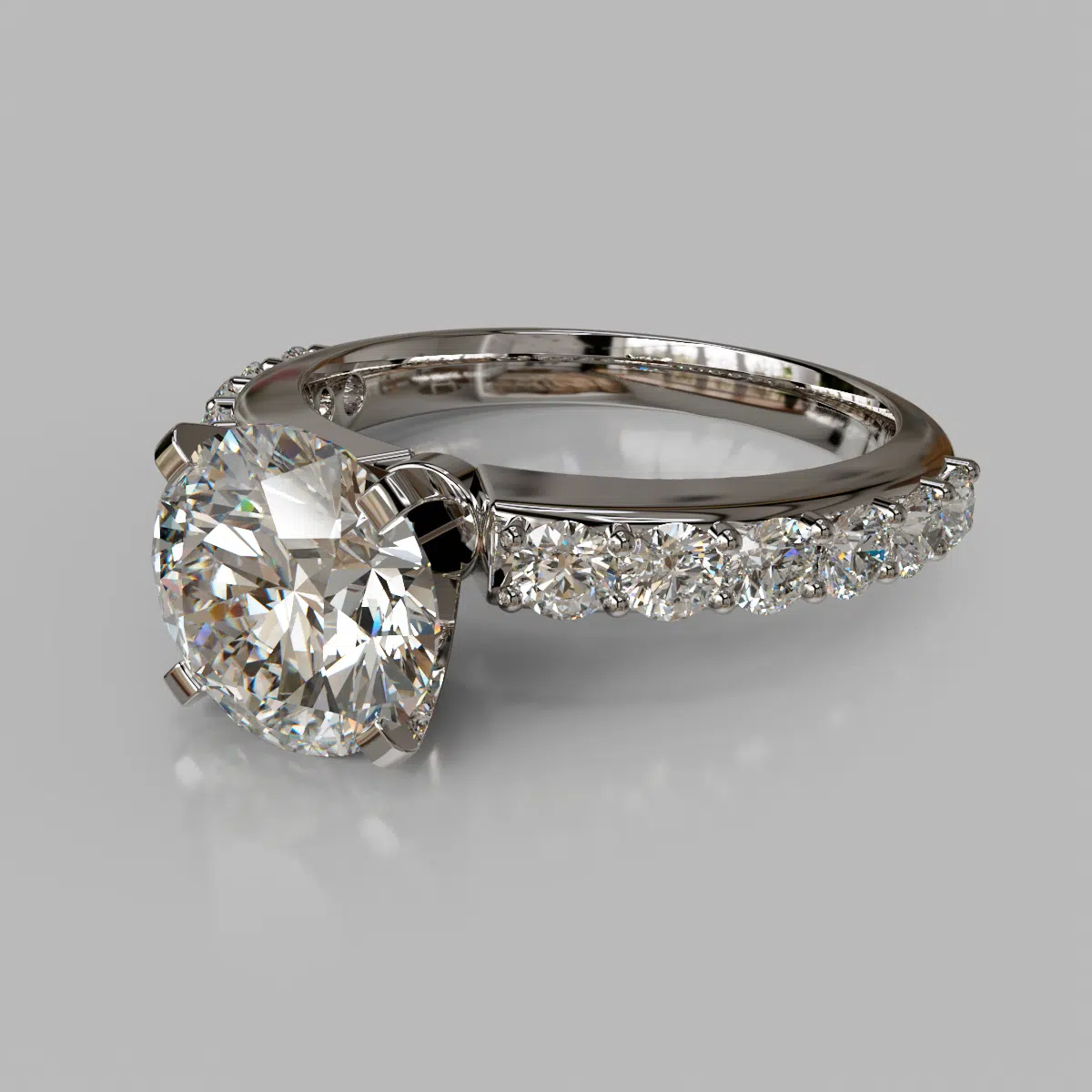 The ring can be customized to your exact specifications to accommodate a center stone from 1.00 to 3.00 carats and it comes as pictured with an additional 12 round brilliant cut side stones, in total carat weight of 0.70 Ct.