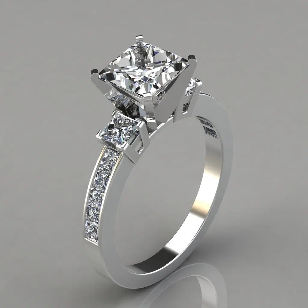 The ring can be customized to your exact specifications to accommodate a center stone from 1.00 to 3.00 carats and it comes as pictured with an additional 12 princess cut side stones, in total carat weight of 0.77 Ct.