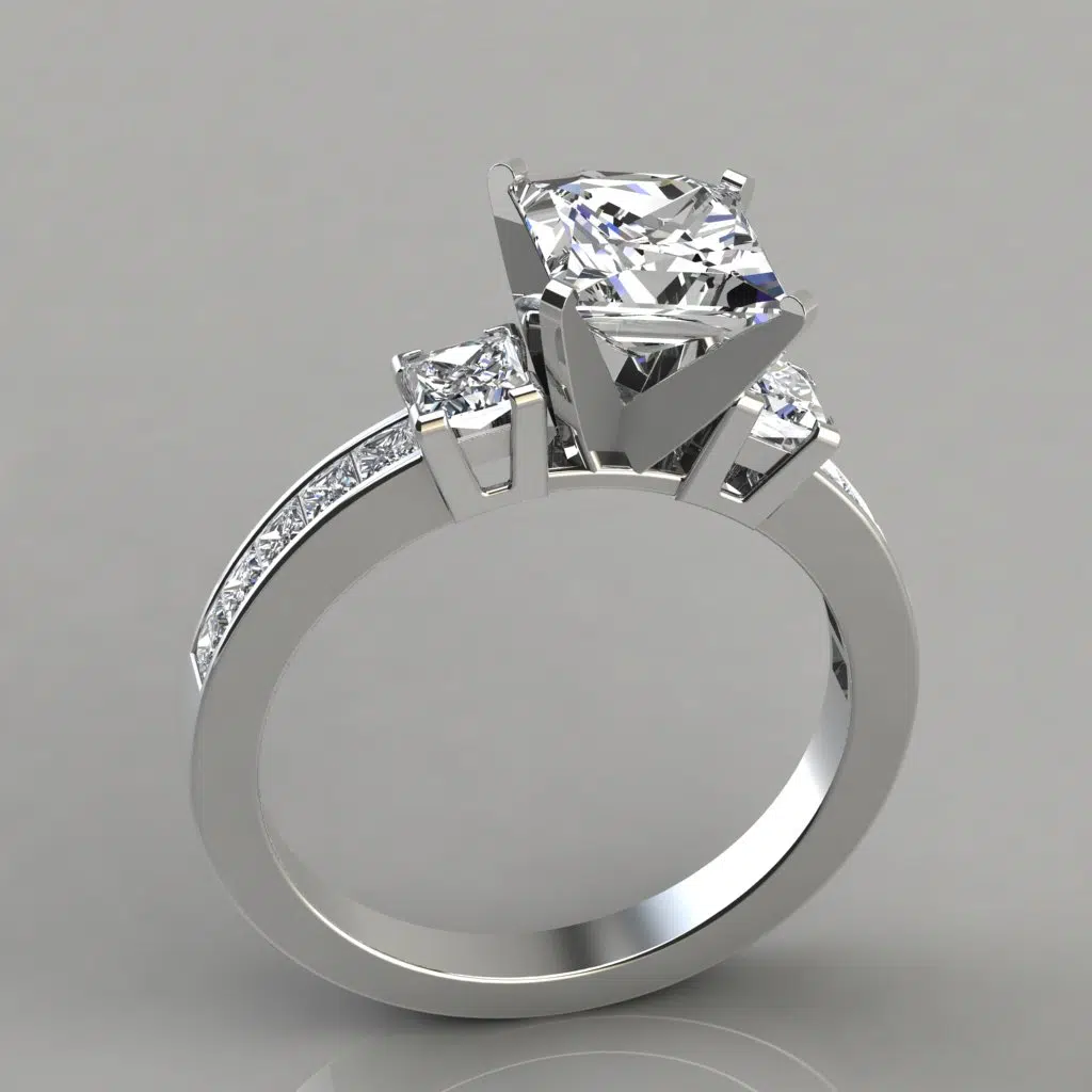 This Beautiful Three Stone Princess Cut Moissanite Engagement Ring is available in White, Yellow or Rose Solid Gold (14K or 18K) and also in Platinum.