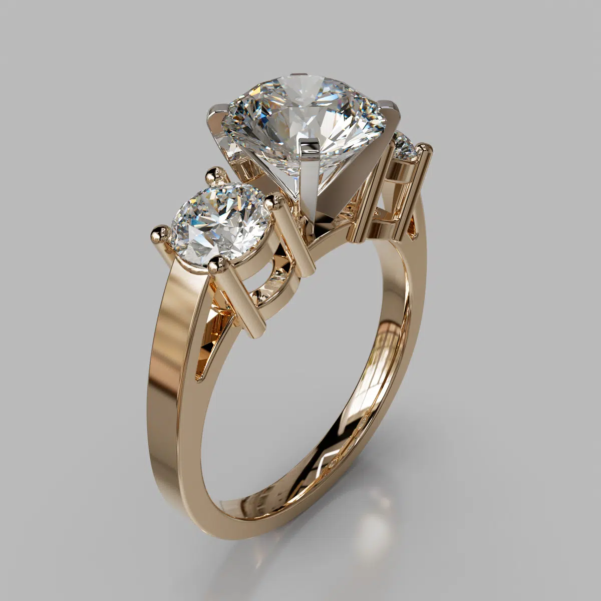 This Beautiful Three Stone Round Cut Designer Moissanite Engagement Ring is available in White, Yellow or Rose Solid Gold (14K or 18K) and also in Platinum.