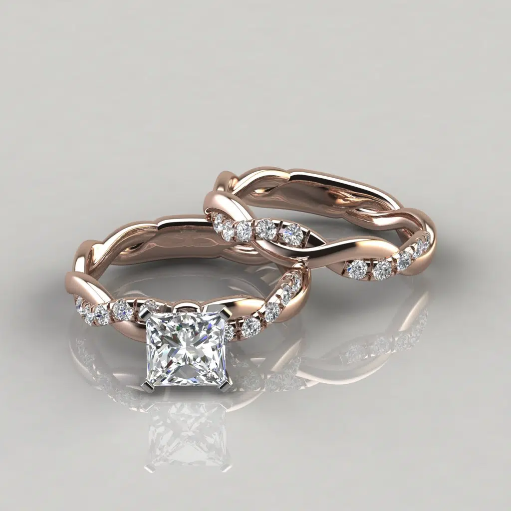 This Beautiful Moissanite Twist Princess Cut Engagement Ring and Wedding Band Set is available in White, Yellow or Rose Solid Gold (14K or 18K) and also in Platinum.