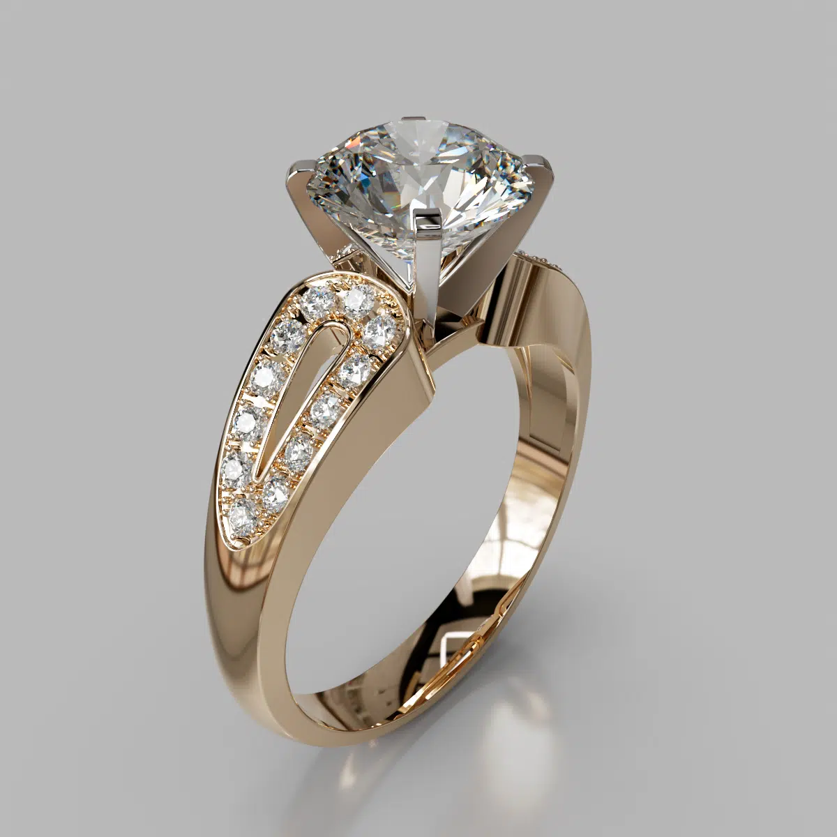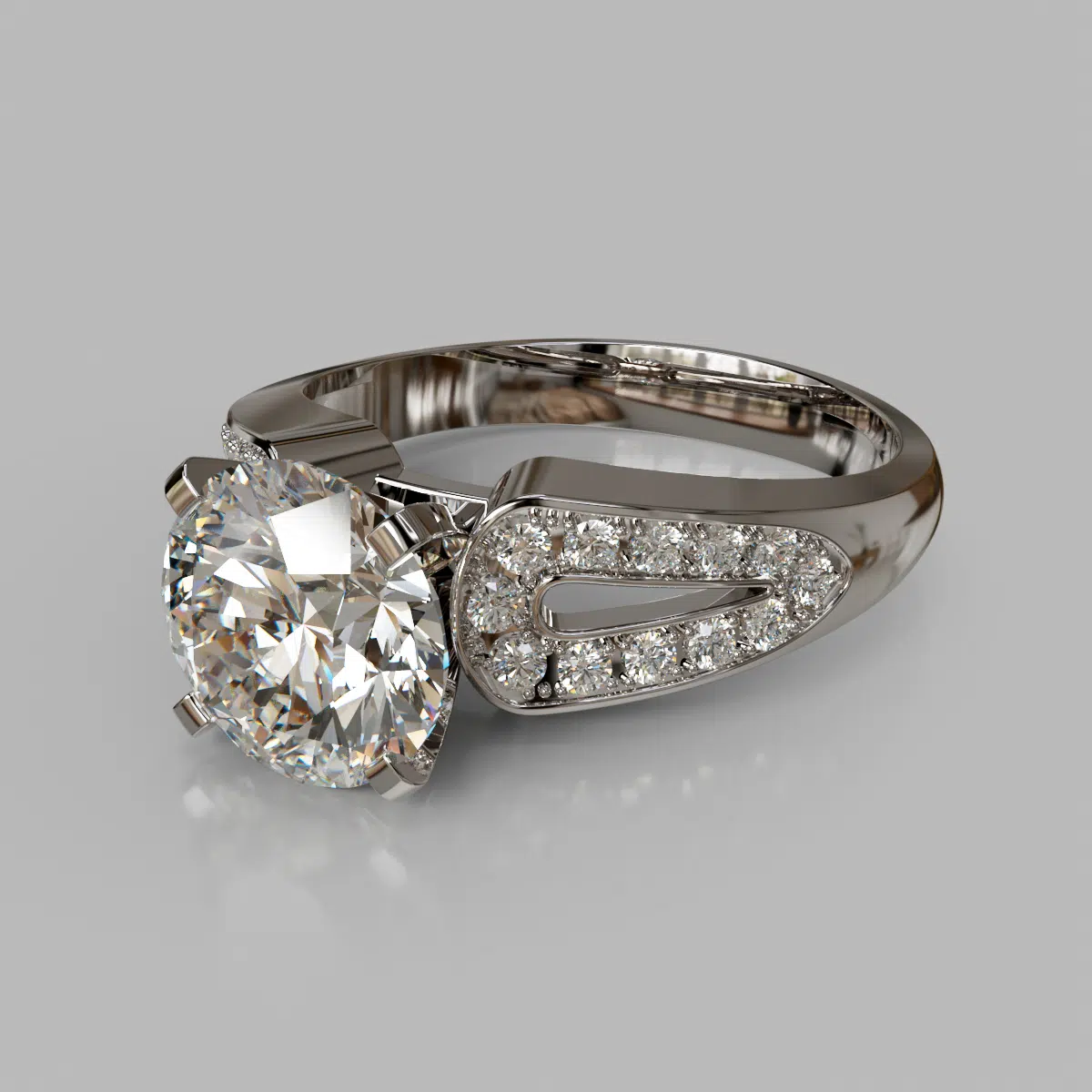 The Split Shank Moissanite Ring can be customized to your exact specifications to accommodate a center stone from 1.00 to 3.00 carats and it comes as pictured with an additional 24 round brilliant cut side stones, in total carat weight of 0.12 Ct.