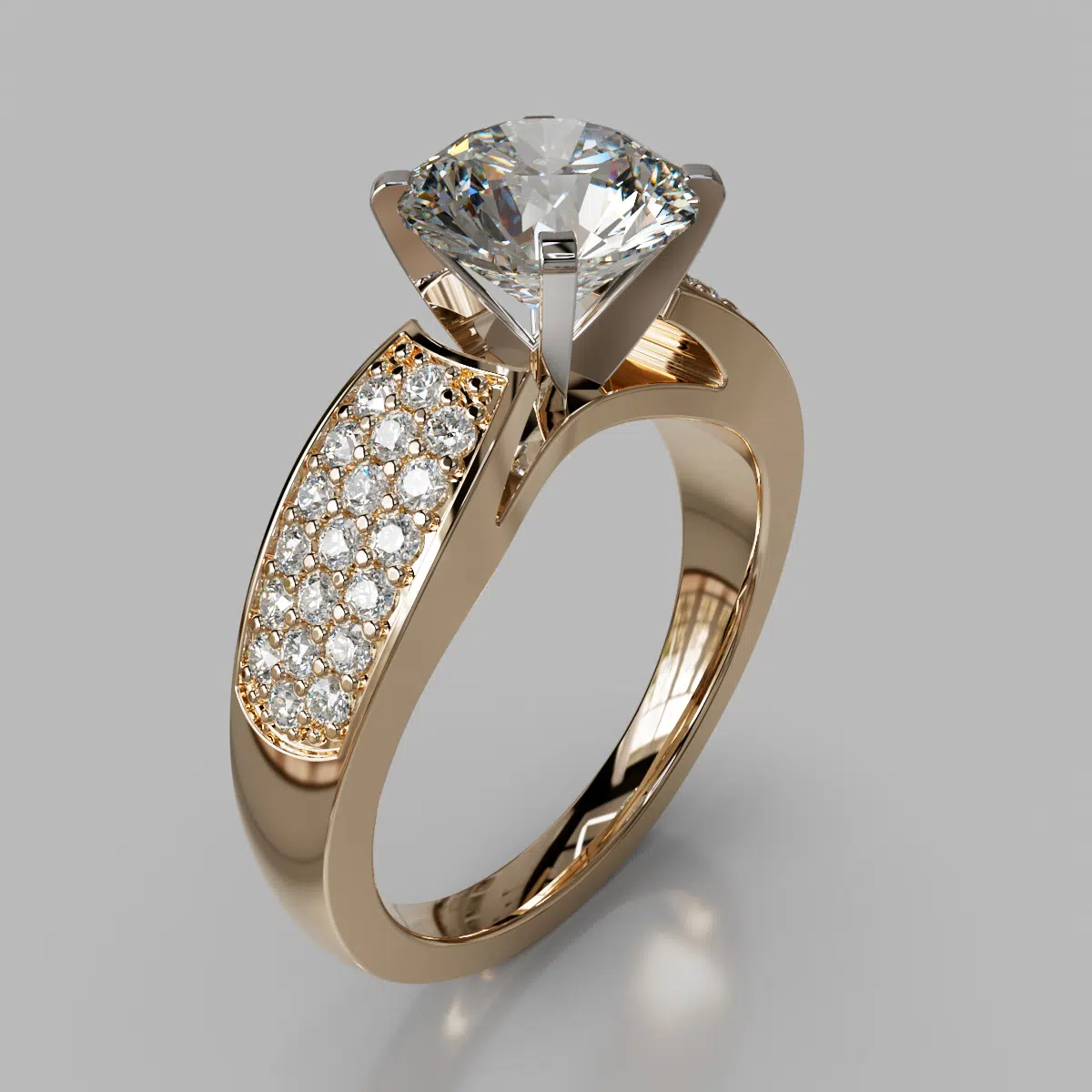This Beautiful Wide Band Round Cut Moissanite Engagement Ring is available in White, Yellow or Rose Solid Gold (14K or 18K) and also in Platinum.